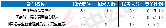 截止到15日16時,寧夏國考報名人數(shù)前三位的部門依次是:蘭州鐵路公安局、國家統(tǒng)計局寧夏調(diào)查總隊、中國證券監(jiān)督管理委員會寧夏監(jiān)管局。