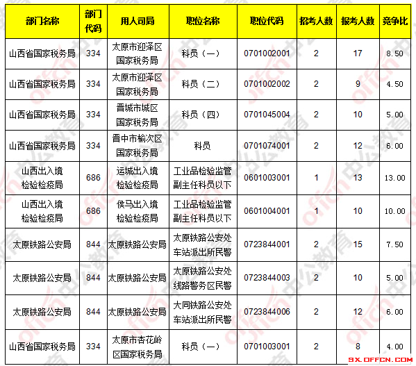 報(bào)考人數(shù)前八位的職位主要集中在山西省國(guó)家稅務(wù)局、山西出入境檢驗(yàn)檢疫局、太原鐵路公安等部門,具體信息如下: