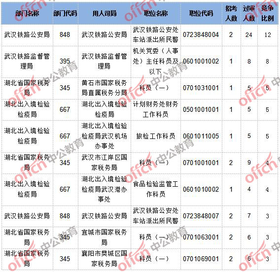 截止到10月15日16時(shí),報(bào)名通過(guò)審核人數(shù)和競(jìng)爭(zhēng)比例的職位同為武漢鐵路公安處車站派出所民警一職,招錄2人,過(guò)審人數(shù)24人,競(jìng)爭(zhēng)比例為12:1。具體信息如下: