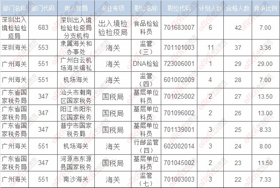 截止到15日16時(shí),競(jìng)爭(zhēng)比例的職位為廣州海關(guān)廣州白云機(jī)場(chǎng)海關(guān)緝私分局DNA檢驗(yàn)一職,招錄1人,截止到15日16時(shí)通過(guò)人數(shù)為29人。