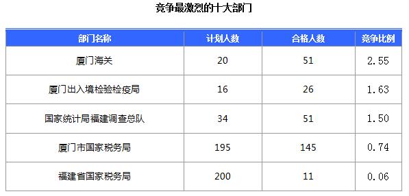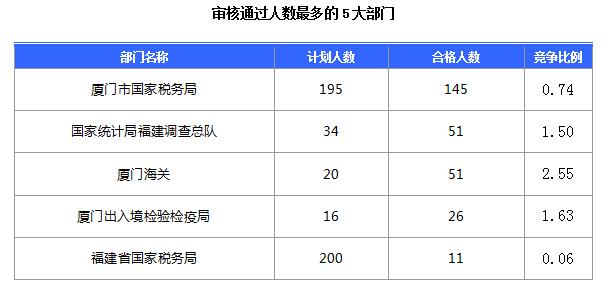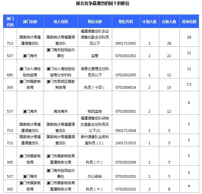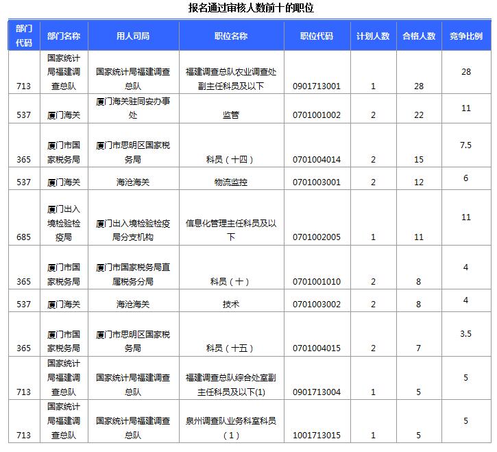 報(bào)名通過審核人數(shù)前十的職位主要集中在國家統(tǒng)計(jì)局福建調(diào)查總隊(duì)、廈門海關(guān)駐同安辦事處、廈門市思明區(qū)國家稅務(wù)局等部門,具體信息如下: