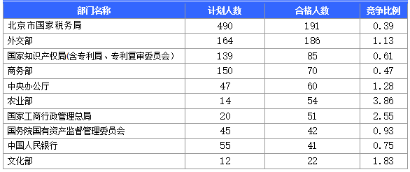 為幫助廣大考生更清晰的了解今日報名情況,北京中公網(wǎng)校整理了審核通過人數(shù)前十位的部門以及競爭比例最激烈的十大部門,供廣大考生參考: