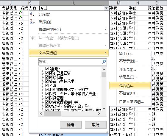 由于專業(yè)要求一欄包含的內(nèi)容繁多,通過普通篩選來尋找適合自己的職位“工作量”較大,因此中公網(wǎng)校專家建議考生使用文本篩選,通過搜索專業(yè)關(guān)鍵字來定位想要尋找的專業(yè),職位選擇效率。文本篩選的操作方法是:在篩選中點(diǎn)擊【文本篩選】,選擇【包含】,在文本框中輸入想要查詢的專業(yè),確定后專業(yè)要求列中顯示的即為篩選后的專業(yè)。