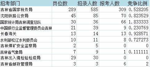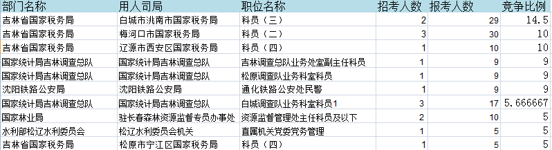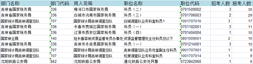 報名通過審核人數(shù)前十的職位主要集中在吉林省國稅局和國家統(tǒng)計局吉林調查總隊,具體信息如下: