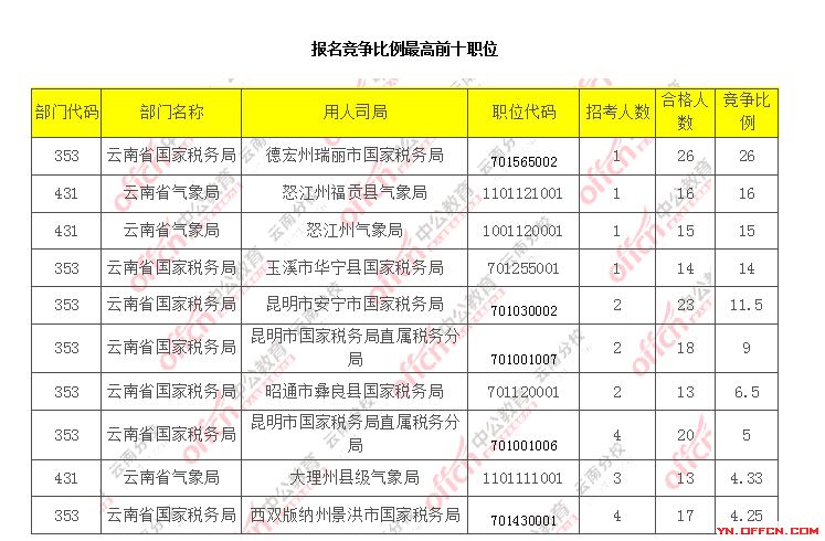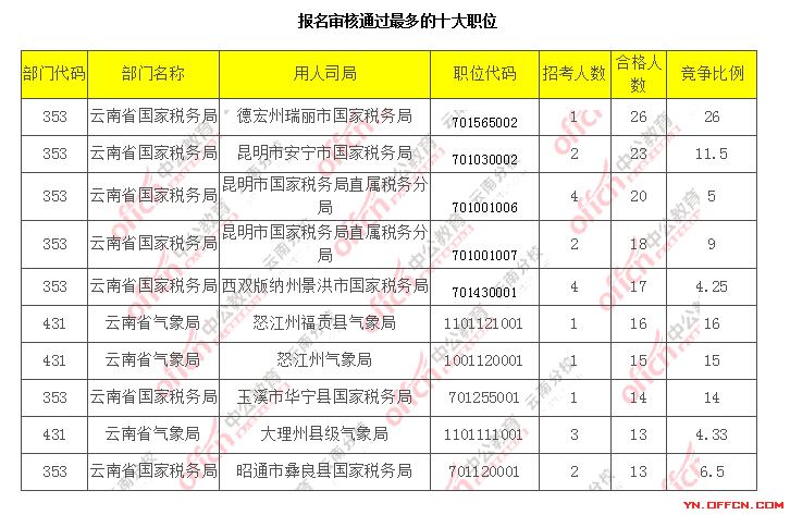 報(bào)名通過(guò)審核人數(shù)前十的職位主要集中在云南省國(guó)家稅務(wù)局、云南氣象局,具信息如下: