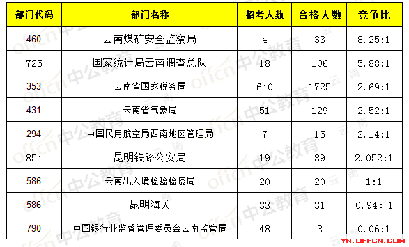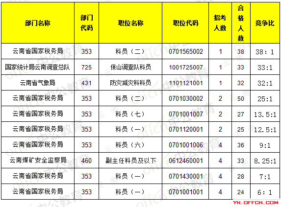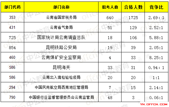 報(bào)名通過審核人數(shù)前十的職位主要集中在云南省國家稅務(wù)局、云南煤礦安全監(jiān)察局,具體信息如下: