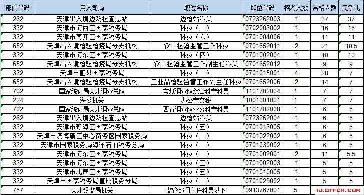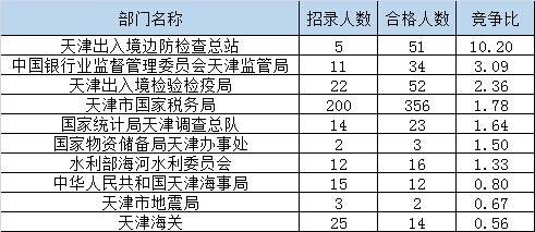 報名通過審核人數(shù)前十的職位主要集中在天津出入境邊防檢查總站、天津市薊縣國家稅務(wù)局、天津銀監(jiān)局機關(guān),具體信息如下: