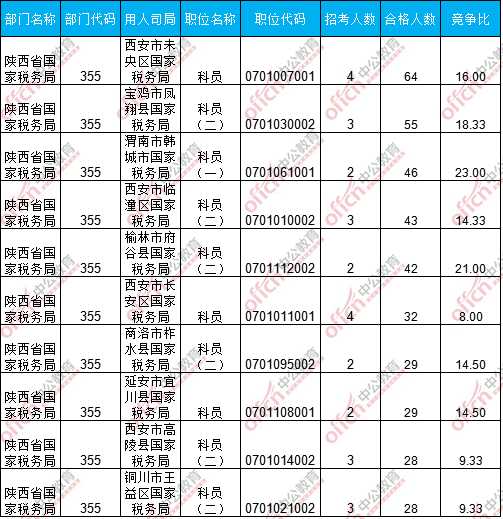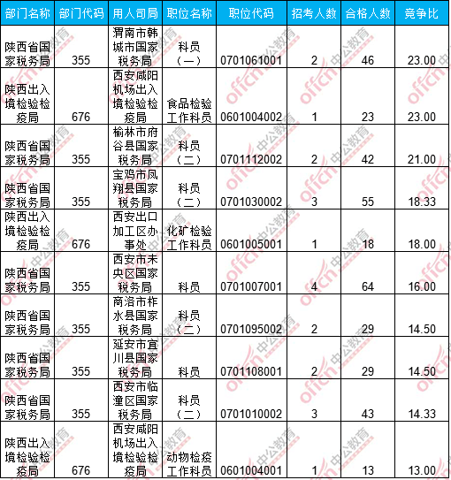 報名通過審核人數(shù)前十的職位主要集中在陜西省國家稅務(wù)局以及陜西出入境檢驗(yàn)檢疫局這兩個部門,具體信息如下: