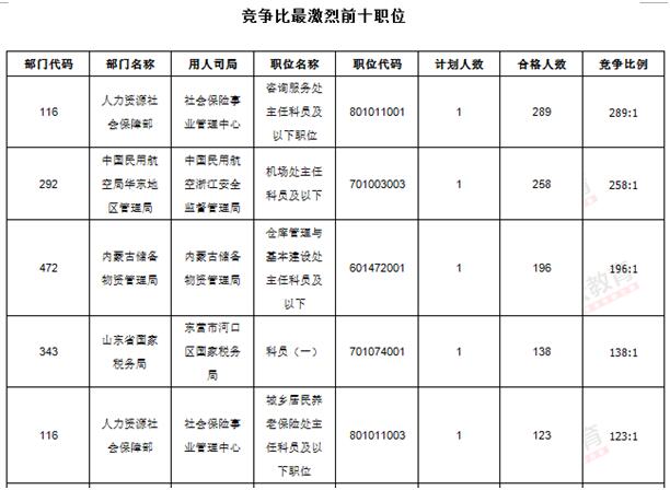在競(jìng)爭力最強(qiáng)前十職位中,有兩個(gè)職位均來自人力資源社會(huì)部,其中人力資源社會(huì)部社會(huì)保險(xiǎn)事業(yè)管理中心咨詢服務(wù)處主任科員及以下職位(代碼801011001)這一職位取代了遼寧儲(chǔ)備物資管理局保衛(wèi)處主任科員及以下(職位代碼601474002)的“寶座”地位,成為今日最難考職位,競(jìng)爭比例已高達(dá)289:1,該職位處于中央機(jī)關(guān),前景廣闊,且招錄條件相對(duì)寬松,很有可能制造“千里挑一”的局面。