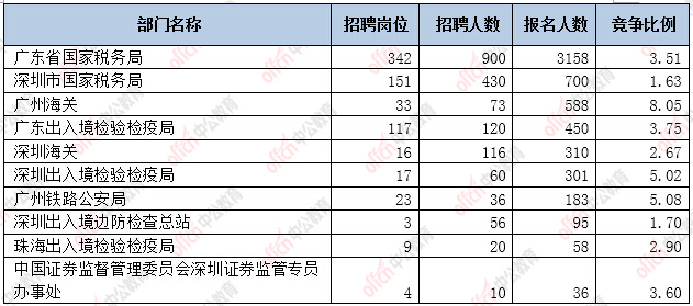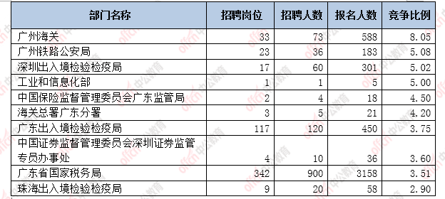 為幫助廣大考生更清晰的了解今日報名情況,廣東中公網(wǎng)校整理了審核通過人數(shù)前十位的部門以及競爭比例最激烈的十大部門,供廣大考生參考: