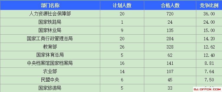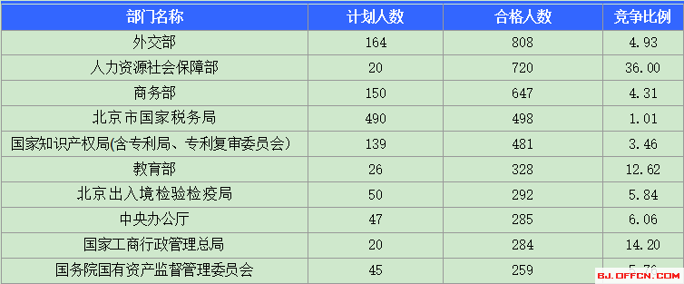 為幫助廣大考生更清晰的了解今日報(bào)名情況,北京中公網(wǎng)校整理了合格人數(shù)前十位的部門以及競爭比例最激烈的十大部門,供廣大考生參考: