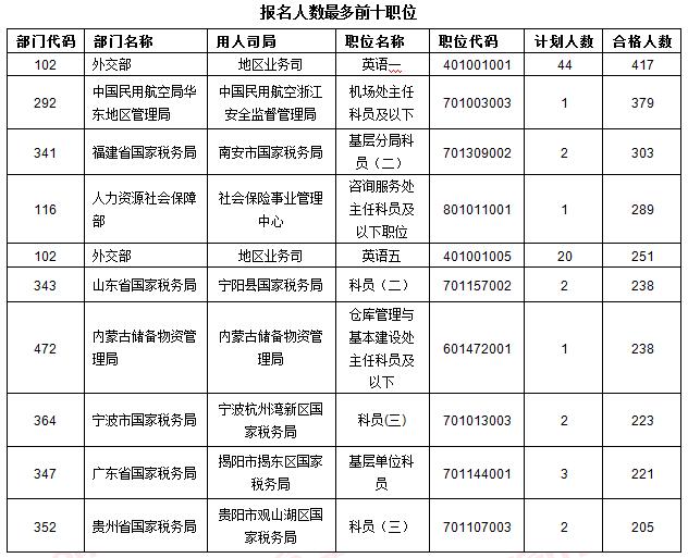 報(bào)名人數(shù)最多前十職位的合格人數(shù)均在200以上,外交部地區(qū)業(yè)務(wù)司英語一(職位代碼401001001)計(jì)劃招錄44人,目前已有417人報(bào)名,蟬聯(lián)報(bào)名人數(shù)最多前十職位榜單“寶座”,的原因除了外交部自身的魅力外,也與招錄基數(shù)較大有關(guān)。