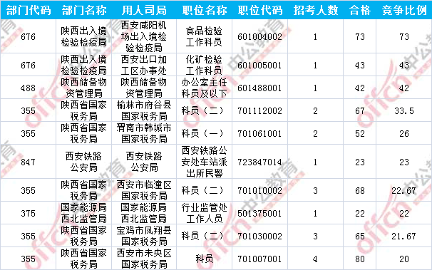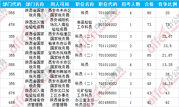 報(bào)名通過(guò)審核人數(shù)前十的職位主要集中在陜西省國(guó)家稅務(wù)局、陜西出入境檢驗(yàn)檢疫局、陜西儲(chǔ)備物資管理局等部門(mén),具體信息如下: