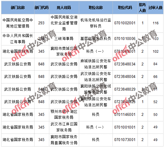 截止到10月17日8時,報名通過審核人數(shù)和競爭比例的職位為中國民用航空湖北安全監(jiān)督管理局機(jī)場處機(jī)場運行監(jiān)察科員一職,招錄1人,過審人數(shù)116人,競爭比例為116:1。具體信息如下: