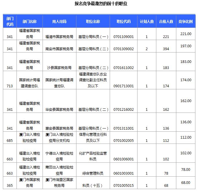 截止到17日16時,競爭比例的職位為福建省國家稅務局福清市國家稅務局基層分局科員(一)一職,招錄1人,截止到17日16時通過人數(shù)為221人