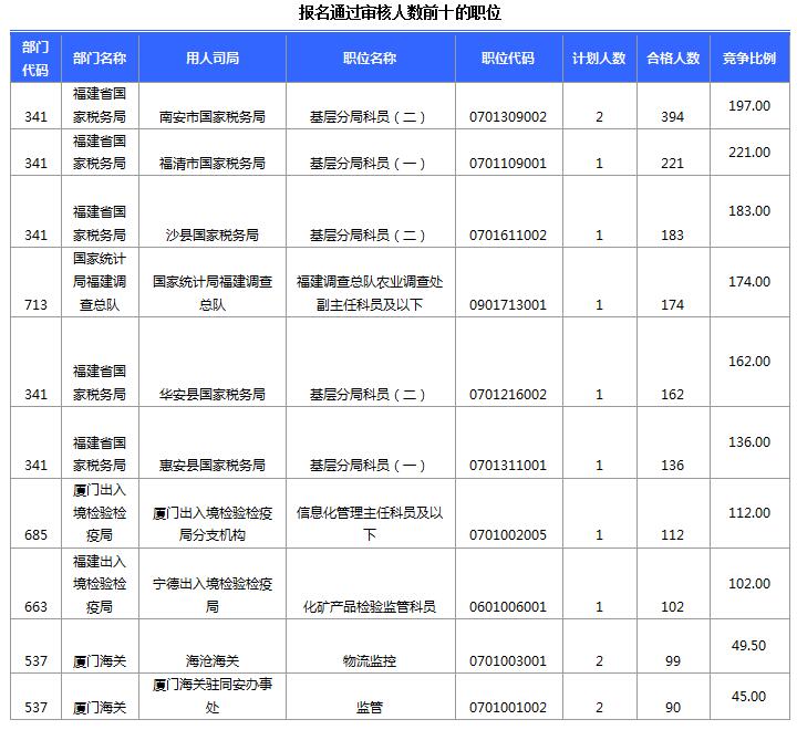 報名通過審核人數(shù)前十的職位主要集中在南安市國家稅務局、福清市國家稅務局、沙縣國家稅務局等部門,具體信息如下: