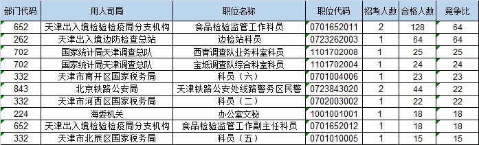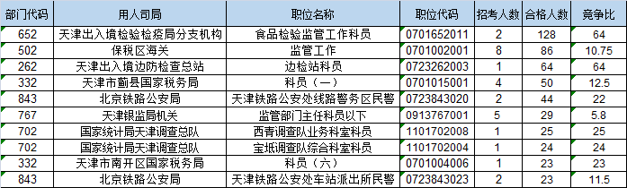 報(bào)名通過審核人數(shù)前十的職位主要集中在天津出入境檢驗(yàn)檢疫局分支機(jī)構(gòu)、保稅區(qū)海關(guān)、天津出入境邊防檢查總站,具體信息如下: