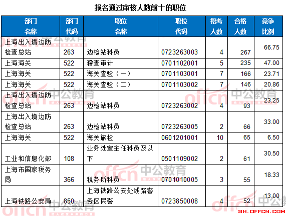 報(bào)名通過(guò)審核人數(shù)前十的職位主要集中在上海出入境邊防檢查總站、上海海關(guān)、工業(yè)和信息化部,具體信息如下: