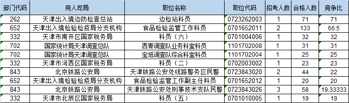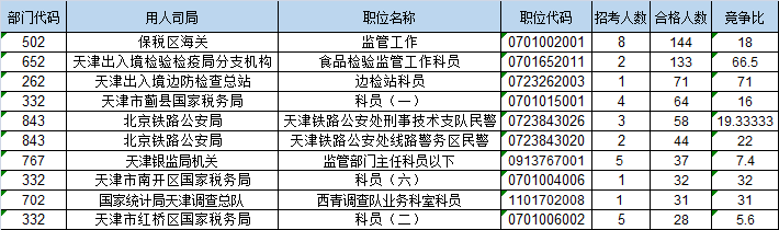 報名通過審核人數(shù)前十的職位主要集中在保稅區(qū)海關、天津出入境檢驗檢疫局分支機構、天津出入境邊防檢查總站,具體信息如下: