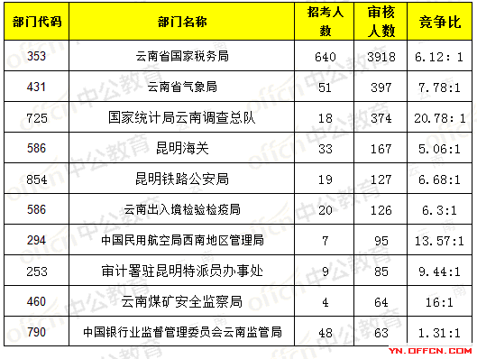 為幫助廣大考生更清晰地了解今日報(bào)名情況,云南中公網(wǎng)校整理了審核通過人數(shù)部門排名,供廣大考生參考: