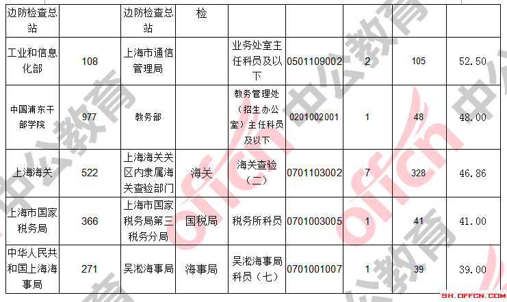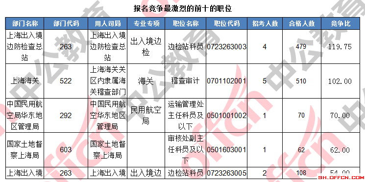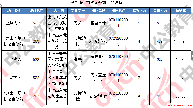 報名通過審核人數前十的職位主要集中在上海出上海海關、上海出入境邊防檢查總站、工業(yè)和信息化部,具體信息如下: