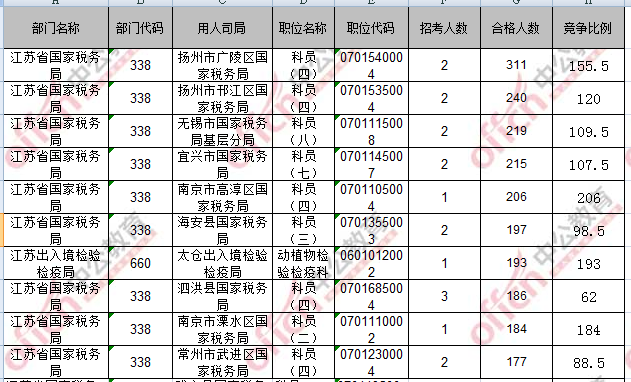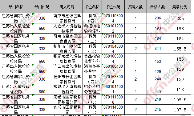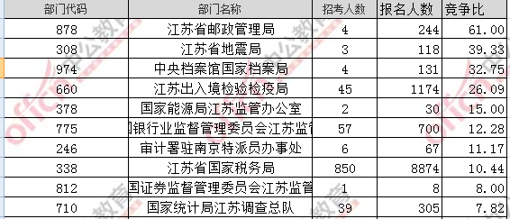 報(bào)名通過審核人數(shù)前十的職位主要集中在江蘇省國(guó)家稅務(wù)局、江蘇出入境檢驗(yàn)檢疫局,具體信息如下: