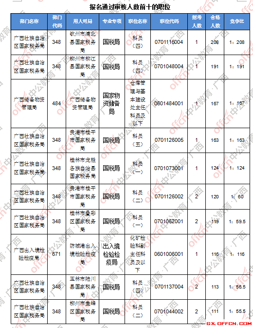 報名通過審核人數(shù)前十的職位主要集中在廣西壯族自治區(qū)國家稅務(wù)局、廣西儲備物資管理局、廣西出入境檢驗檢疫局等部門,具體信息如下:
