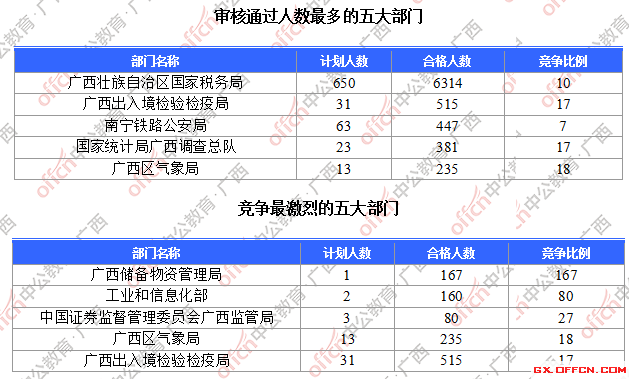 為幫助廣大考生更清晰的了解今日報名情況,廣西中公網(wǎng)校整理了審核通過人數(shù)前五位的部門以及競爭比例最激烈的五大部門,供廣大考生參考: