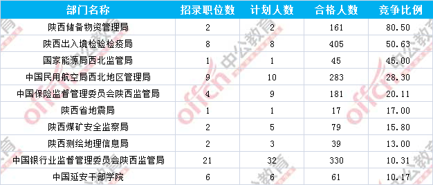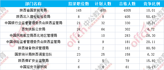 為幫助廣大考生更清晰的了解今日?qǐng)?bào)名情況,陜西中公網(wǎng)校整理了審核通過(guò)人數(shù)前十位的部門以及競(jìng)爭(zhēng)比例最激烈的十大部門,供廣大考生參考:中公網(wǎng)校