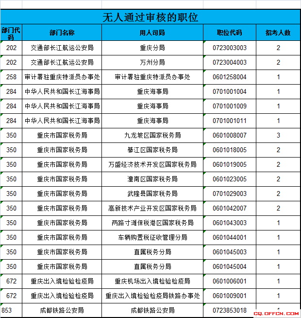 重慶無人報(bào)考的職位逐漸在減少,現(xiàn)在重慶的職位暫有19個(gè)職位無人報(bào)考,占全部職位的6%,無人報(bào)考職位如下: