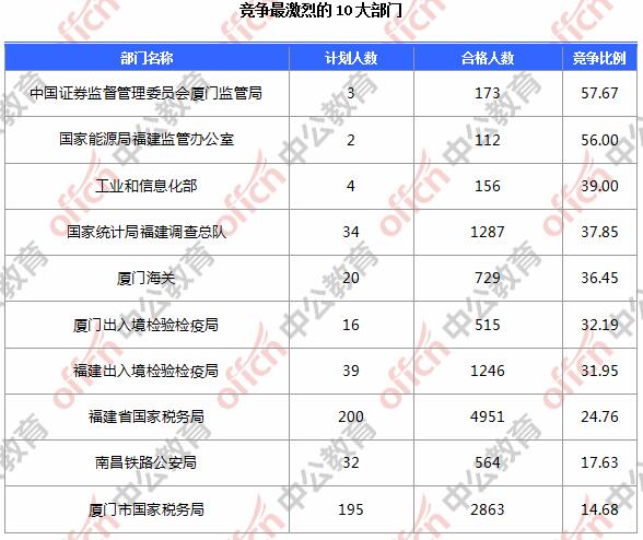 為幫助廣大考生更清晰的了解今日報名情況,福建中公網(wǎng)校整理了審核通過人數(shù)前10位的部門以及競爭比例最激烈的10大部門,供廣大考生參考: