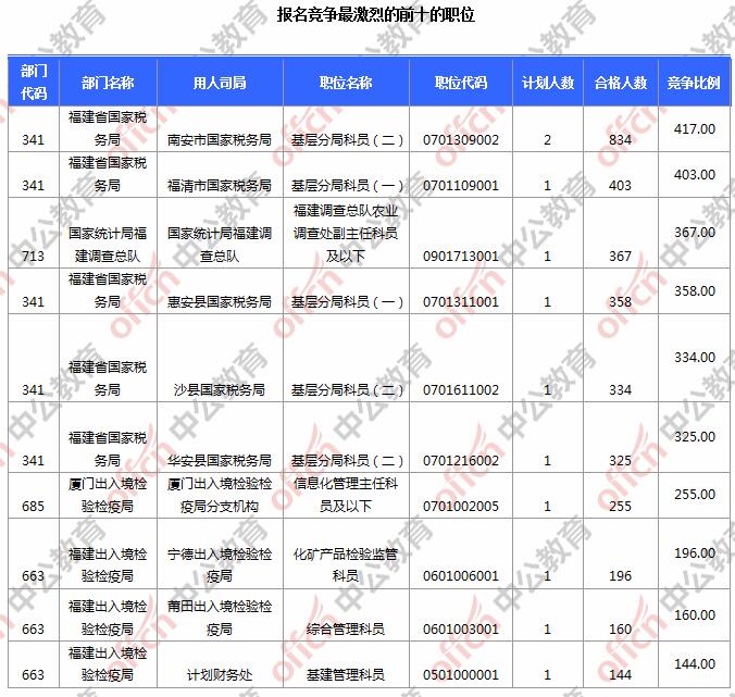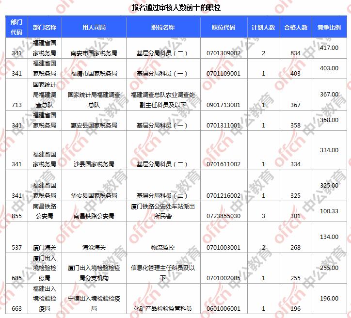 報名通過審核人數(shù)前十的職位主要集中在南安市國家稅務(wù)局、福清市國家稅務(wù)局、國家統(tǒng)計局福建調(diào)查總隊等部門,具體信息如下: