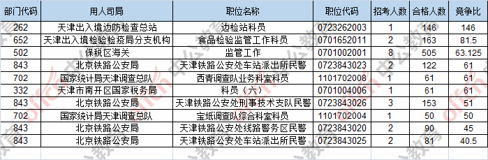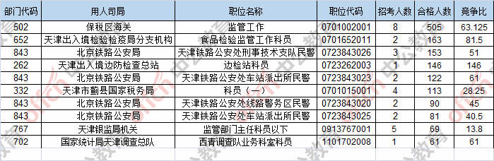 報名通過審核人數(shù)前十的職位主要集中在保稅區(qū)海關(guān)、天津出入境檢驗(yàn)檢疫局分支機(jī)構(gòu)、北京鐵路公安局,具體信息如下: