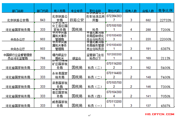 報名通過審核人數(shù)前十的職位主要集中在北京鐵路公安局、河北省國家稅務局、中央辦公廳等部門,具體信息如下: