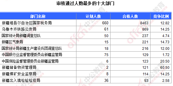 為幫助廣大考生更清晰的了解今日報名情況,新疆中公網(wǎng)校整理了審核通過人數(shù)前十位的部門以及競爭比例最激烈的十大部門,供廣大考生參考: