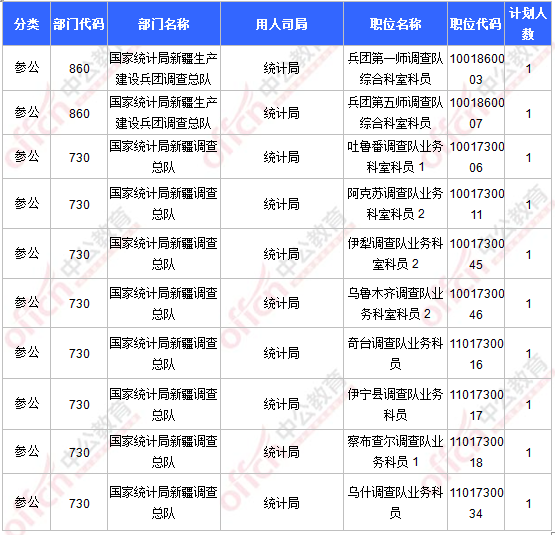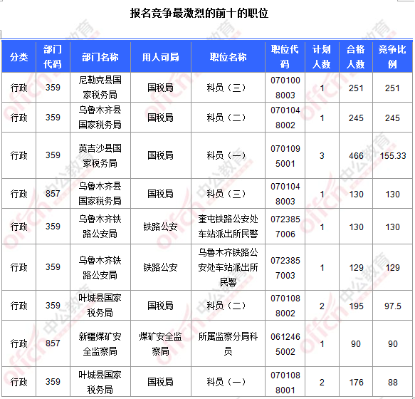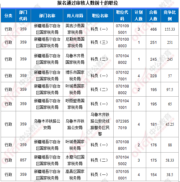 報名通過審核人數(shù)前十的職位主要集中在新疆維吾爾自治區(qū)國家稅務(wù)局、烏魯木齊鐵路公安局等部門,具體信息如下: