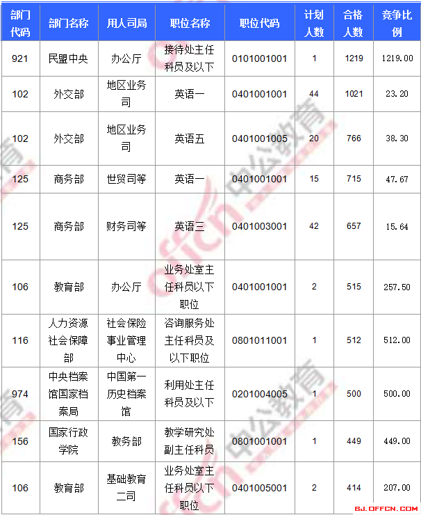 合格人數(shù)前十的職位主要集中在外交部、民盟中央、商務(wù)部等部門,具體信息如下: