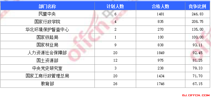 為幫助廣大考生更清晰的了解今日報名情況,北京中公網(wǎng)校整理了合格人數(shù)前十位的部門以及競爭比例最激烈的十大部門,供廣大考生參考: