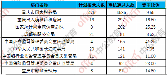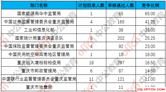 為幫助廣大考生更清晰的了解今日報名情況,重慶中公網(wǎng)校整理了合格人數(shù)前十位的部門以及競爭比例最激烈的十大部門,供廣大考生參考: