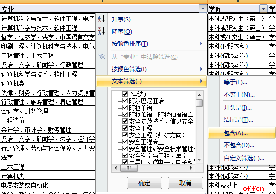在“專業(yè)”一項中點擊下拉菜單,選擇“文本篩選”,選擇“包含”一項。