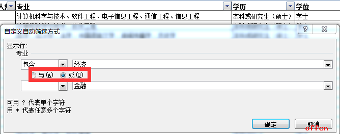 中公網(wǎng)校專家提醒考生,在文本篩選中要嚴格區(qū)分“與”與“或”兩個篩選條件的區(qū)別,“與”的篩選條件是“兩者全包括”,而“或”的篩選條件是“兩者任一或全部均可”。 例如:我們篩選“經(jīng)濟金融”的專業(yè),如下圖: