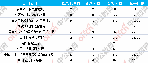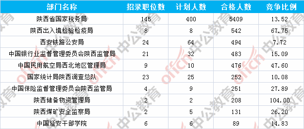 為幫助廣大考生更清晰的了解今日?qǐng)?bào)名情況,陜西中公教育整理了審核通過(guò)人數(shù)前十位的部門(mén)以及競(jìng)爭(zhēng)比例最激烈的十大部門(mén),供廣大考生參考: