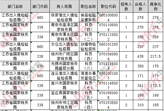 報名通過審核人數(shù)前十的職位主要集中在江蘇省國家稅務(wù)局、江蘇出入境檢驗(yàn)檢疫局,具體信息如下: