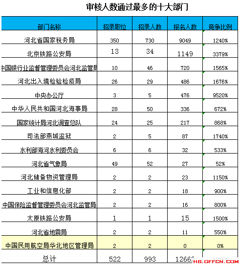 截止到20日8時(shí),通過審核人數(shù)前三位的部門依次是:河北省國家稅務(wù)局、北京鐵路公安局、中國銀行業(yè)監(jiān)督管理委員會(huì)河北監(jiān)管局,三部門通過審核總?cè)藬?shù)達(dá)10918人,占通過審核總?cè)藬?shù)的86%。