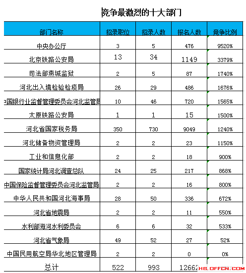 為幫助廣大考生更清晰的了解今日報(bào)名情況,河北中公網(wǎng)校整理了審核通過人數(shù)前十位的部門以及競爭比例最激烈的十大部門,供廣大考生參考: