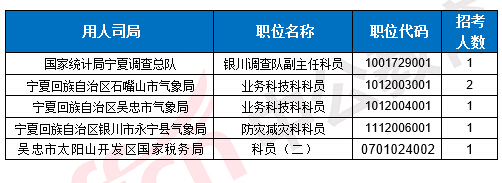 截止到20日8時,工作地點(diǎn)在寧夏的職位共有5個無人報(bào)考。下面是無人報(bào)考職位一覽表,中公網(wǎng)校專家建議廣大考生多關(guān)注一些較冷職位,避免激烈競爭,結(jié)合自身?xiàng)l件,找到屬于自己的職位。