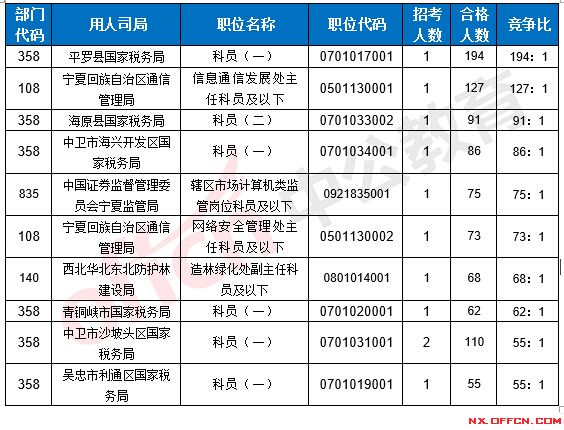 截止到20日8時,寧夏國考合格人數(shù)前三位的部門依次是:寧夏回族自治區(qū)國家稅務(wù)局、工業(yè)和信息化部、中國保險(xiǎn)監(jiān)督管理委員會寧夏監(jiān)管局。