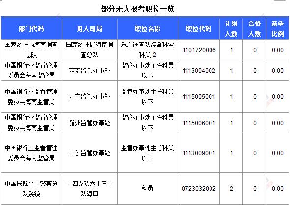 截止到20日8時,工作地點在海南的職位共有21個無人報考。海南中公網(wǎng)校提醒廣大考生,多關(guān)注無人報名職位,會大大降低競爭。
