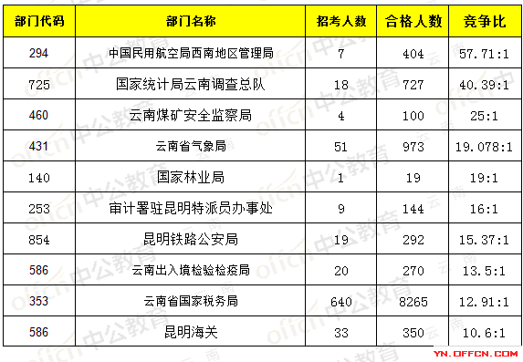 截止20日8時,通過審核人數(shù)前四位的部門依次是:云南省國家稅務局、云南省氣象局、中國銀行業(yè)監(jiān)督管理委員會云南監(jiān)管局、昆明海關,四部門通過審核總?cè)藬?shù)達 10369人,占通過審核總?cè)藬?shù)的87.4%。