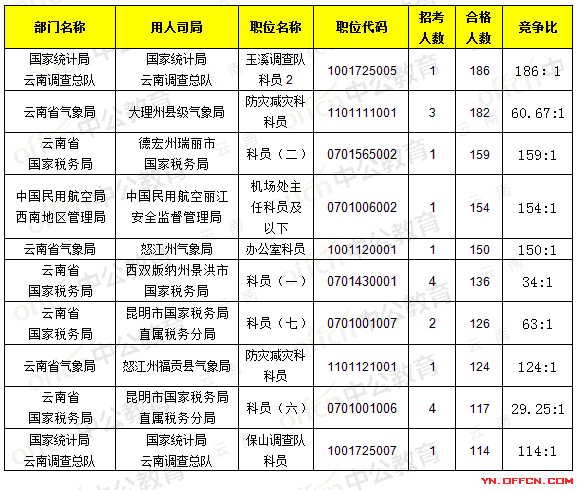 截止20日8時,招錄比例的職位為國家統(tǒng)計局云南調(diào)查總隊,職位代碼是1001725005,招錄7人,通過人數(shù)404人,競爭比186:1